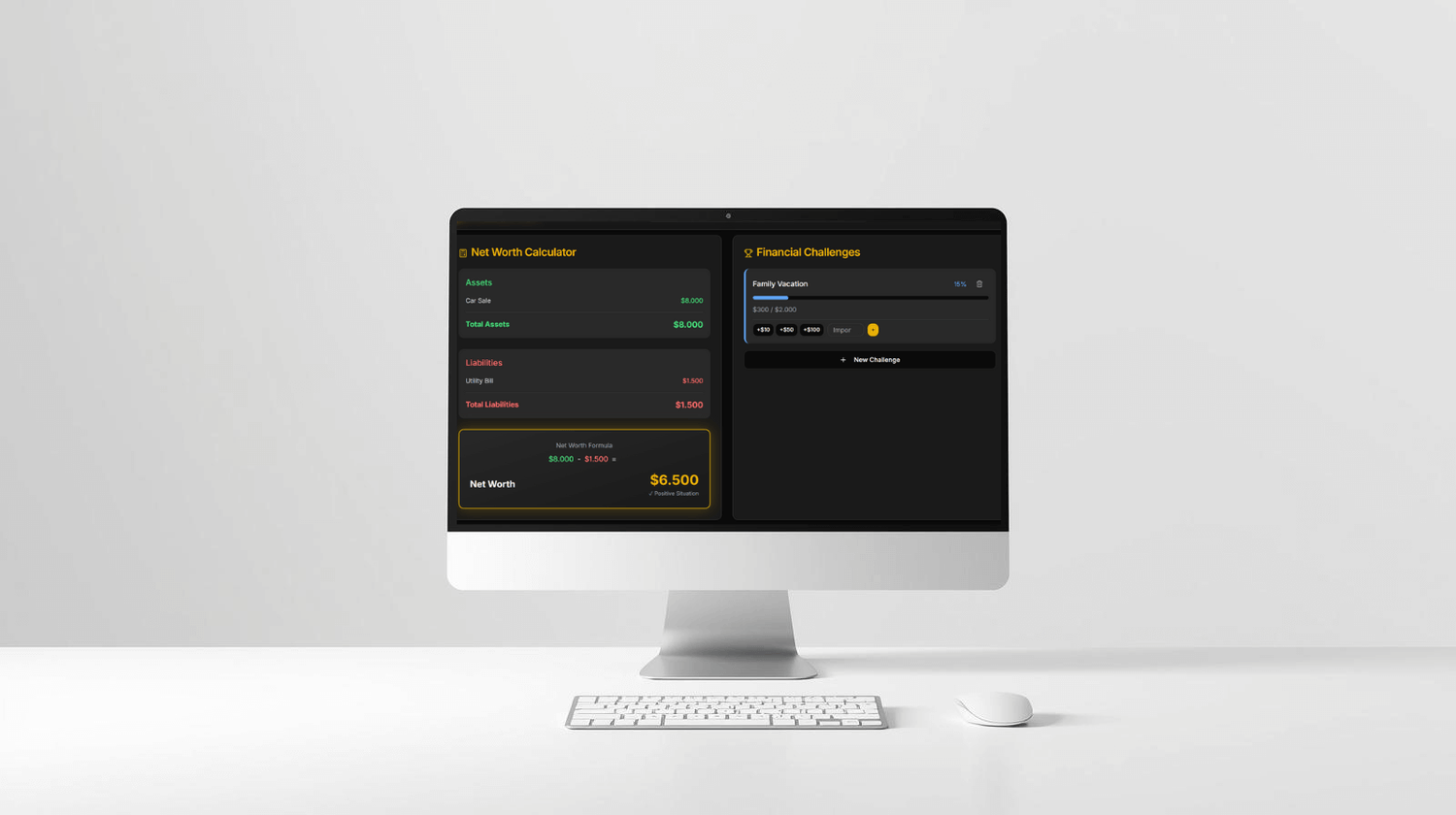 Track your income and expenses with the Net Worth Calculator, set financial goals with Financial Challenges, and follow your progress with ease.